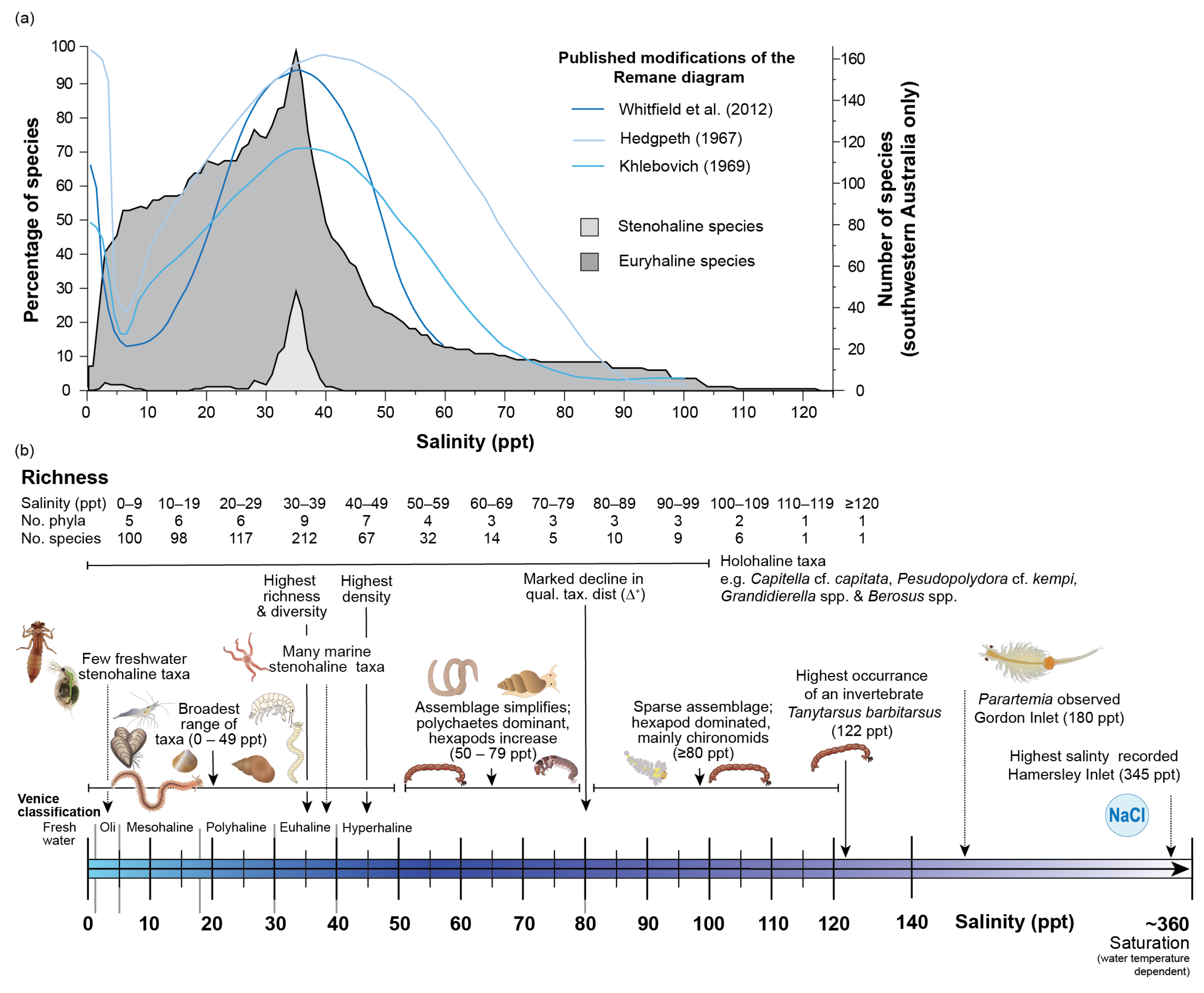 - Lim, R.; Fourie, S.A.; Stout, E.J.; Roots, B.J.; Cronin-O’Reilly, S.; Rodgers, E.M.; Tweedley, J.R. Testing the Remane diagram: Occurrences of benthic macroinvertebrates in oligohaline to hyperhaline salinities. Water 2025, 17, 1642. [Google Scholar] [CrossRef]