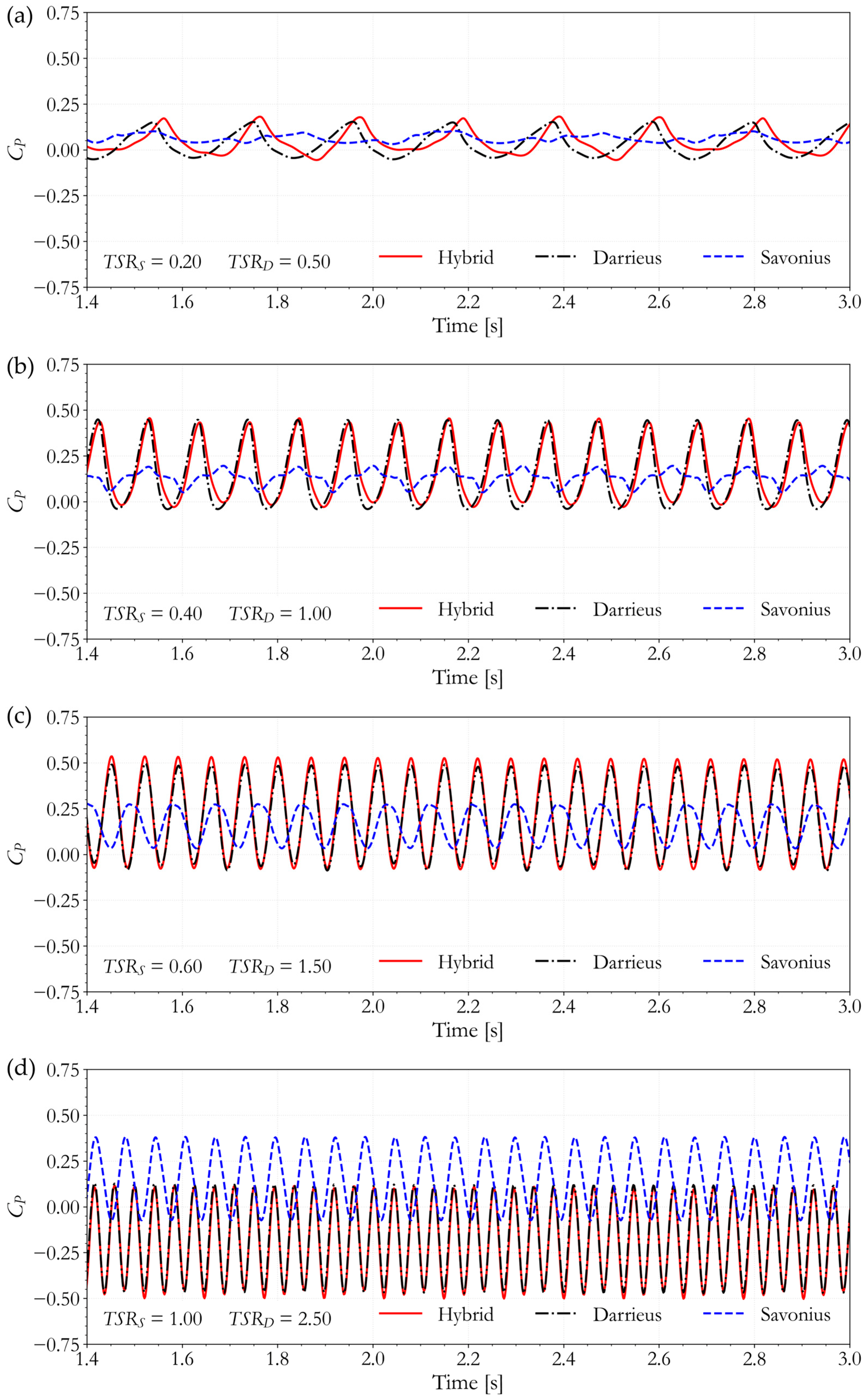 CP) by around 27% for the lowest investigated TSR = 1.45. However, when TSR is augmented, the hybrid turbine performance decreases due to limitations in aerodynamic performance of the Savonius turbine. The insertion of deflectors proved to be a good strategy for solving this problem, since at the optimum TSR = 2.6, the use of deflectors increased the