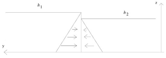The potential energy l(u) of the applied forces is the sum of two terms: the upstream hydrostatic pressure and the downstream hydrostatic pressure (Figure 2). Here, denotes the water level upstream of the boom [], and denotes the downstream water level.