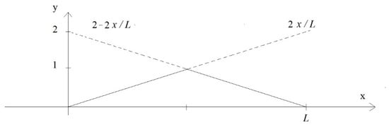 Weighting function along the x-axis addressing the hydrostatic pressure difference between the upstream and downstream sides of a boom section’s length L, taking into account the continuity of the free surface at the boom ends.