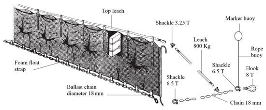 A specific design exists for booms deployed on seabeds. Shore-sealing booms are made of three tubes assembled in a triangular form []. The two juxtaposed bottom tubes are ballasted with water, and the superposed tube is air-inflated. It can handle low tidal variations. An exercise conducted in the Palmonés estuary in the Bay of Algeciras, Spain, documented the use of a water-ballasted boom [], which provided mooring stiffness through weight-induced friction on a sandy beach.