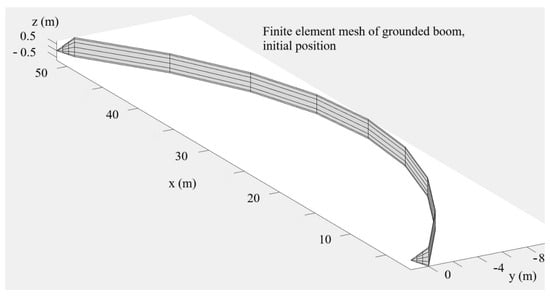 In our reference calculation, the modulus of elasticity by material thickness is 1 × 106 N/m for the lower half of the boom and 0.5 × 106 N/m for the upper part. The difference in hydrostatic pressure between the upstream and downstream sections corresponds to a water height, , of 5 cm. Figure 6 shows the shape of the vertical mid-section with dots in blue. The mid-section exhibits a curved shape. The z-coordinate of the top node tends to decrease.