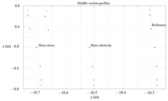Profiles of the mid-section of the boom: blue: the reference calculation; red: the calculation with an increase in hydrostatic pressure, where is 10 cm instead of 5 cm; magenta: the calculation where the modulus of elasticity decreases in the upper part, y-z plan, unit (m); the horizontal force is directed from right to left.