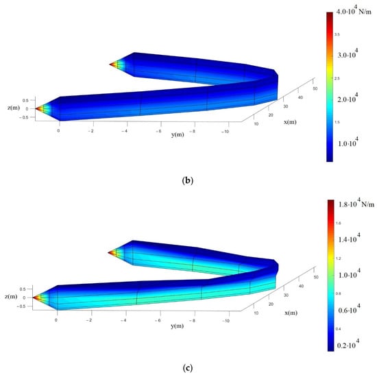 Principal stress (N/m) and deformed geometry of the BALEAR 335 boom: (a) reference calculation: hydrostatic height of 5 cm and modulus of elasticity of 0.5 × 106 N/m in the upper half; (b) hydrostatic height: 10 cm; (c) modulus of elasticity: 1.23 × 105 N/m in the upper half; the horizontal force is directed from left to right.
