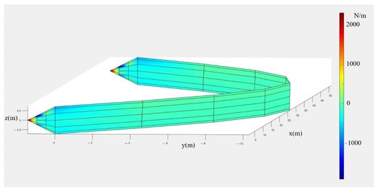 From both hydrostatic and hydrodynamic points of view, no fluid–structure coupling is specifically conducted. Nevertheless, we could evoke the dependencies induced by the coupling between the boom’s geometry and the flow induced. The normal vector depends on u and should be updated. We expect updates to the upstream and downstream hydrostatic pressures on one hand and to the hydrodynamic pressure, depending on the scalar product , on the other hand. The hydrostatic case provides a first-order appraisal of boom submarining, providing the crested flow thickness. Greater precision will require a local flow study, which is not addressed here.