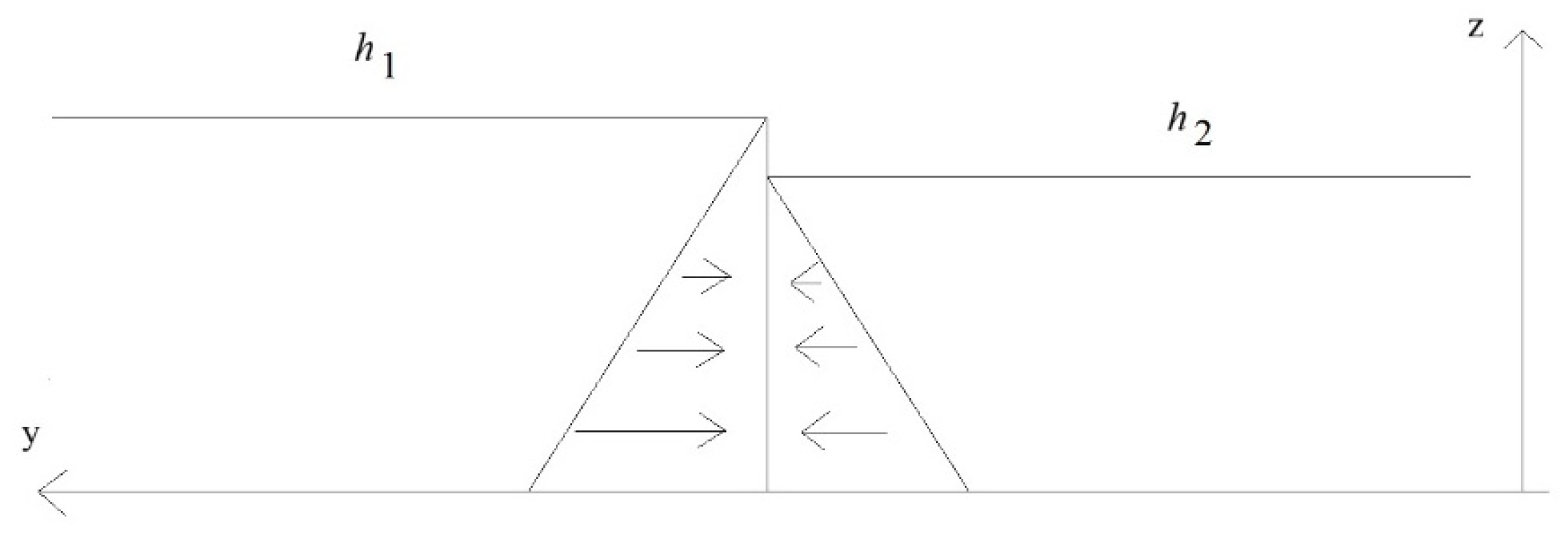 6 N/m for the upper part. The difference in hydrostatic pressure between the upstream and downstream sections corresponds to a water height,