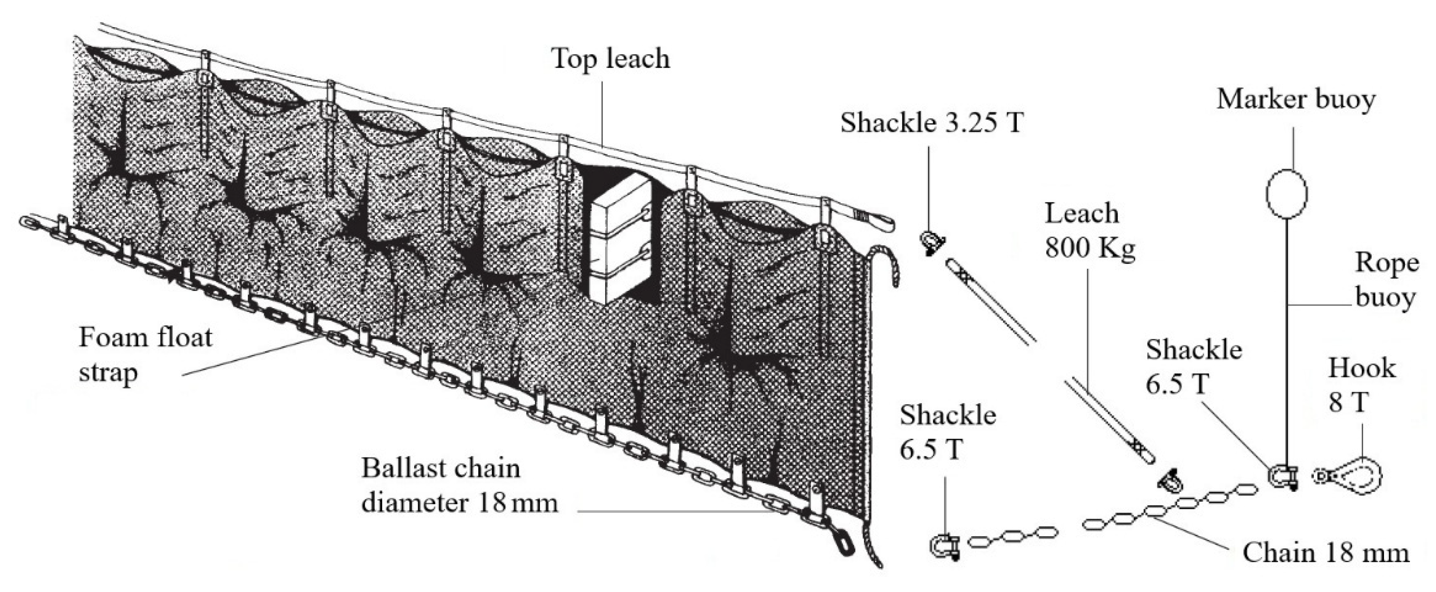 are connected along their top and bottom edges via the top leach and ballast chain. Quarter-turn floats can distribute load and lightly prestress the upper parts of