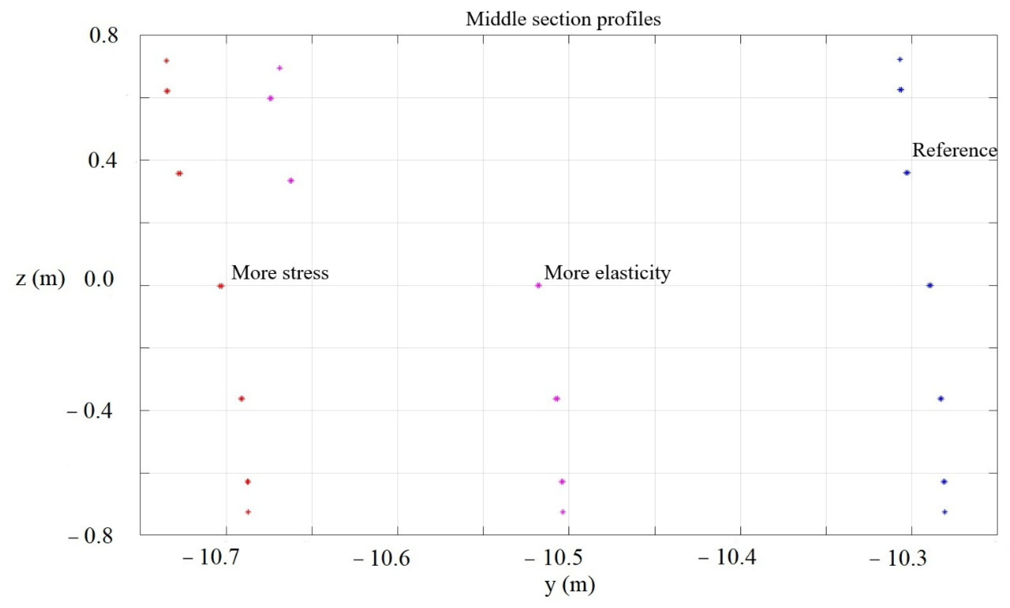 Figure 6 shows the shape of the vertical mid-section with dots in blue. The mid-section exhibits a curved shape. The z-coordinate of the top node tends to decrease.