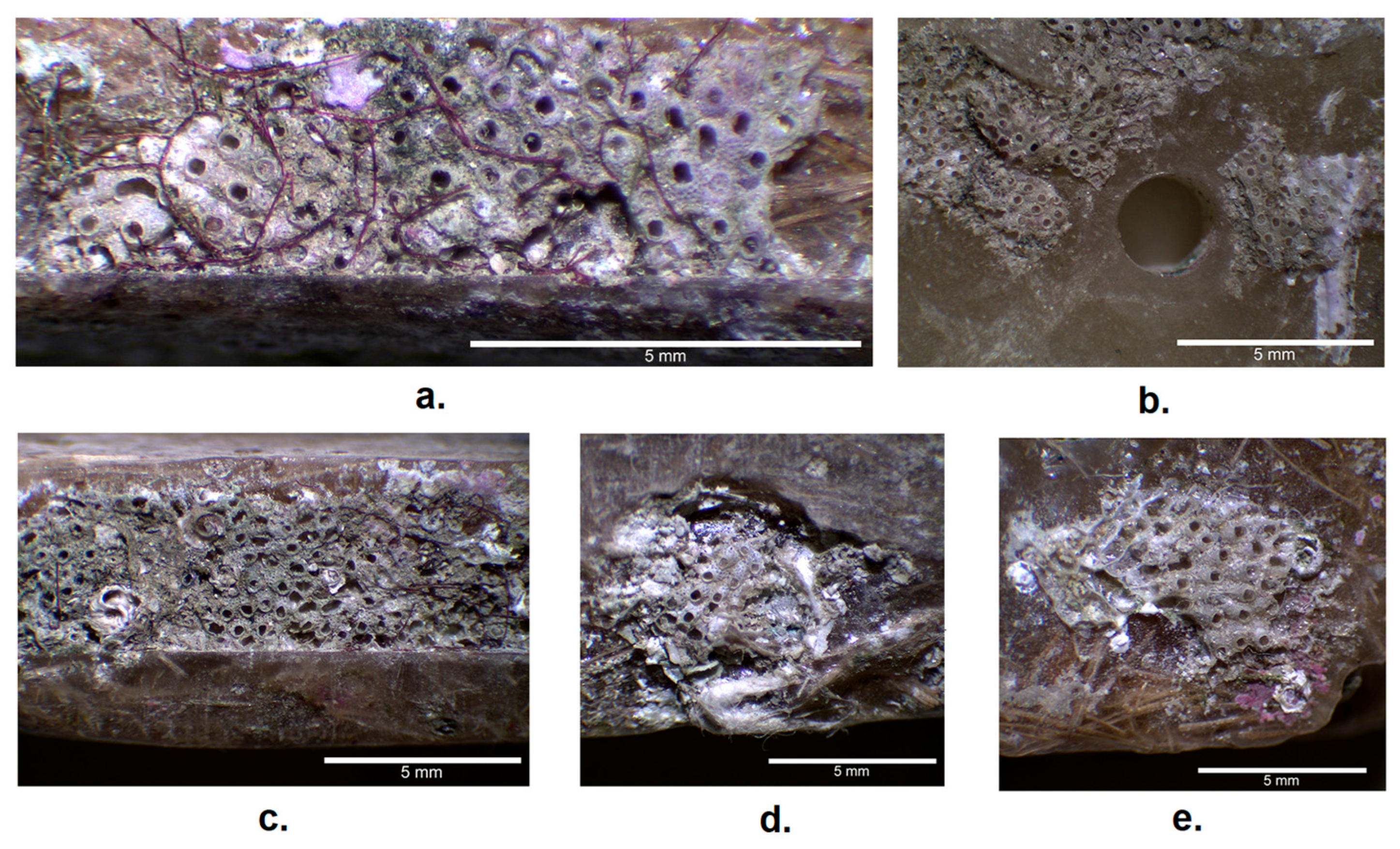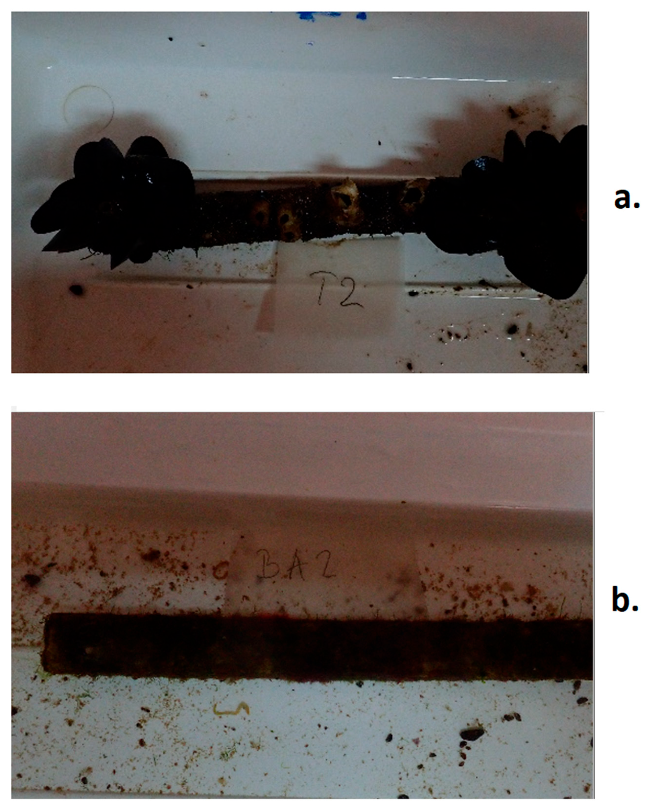 - After six months of composite conditioning and the mechanical removal of as many protruding bioconstruction structures as possible, one can observe from the comparison between the epoxy resin (samples A) and the eco-epoxy resin (samples BA) at the three sites that degradation occurred mainly at Site 2. In particular, sample A2 showed a high level of degradation, with erosion of the material and growth of Balanus sp. (barnacles), gastropods, mussels, Lithophyllum incrustans (coralline algae; a typical coralligenous outcrop of this marine area [49]), and algae. It is also clearly evident that the growth rate on the eco-epoxy resin was considerably lower, a difference that might depend on variations in porosities (Figure 8).