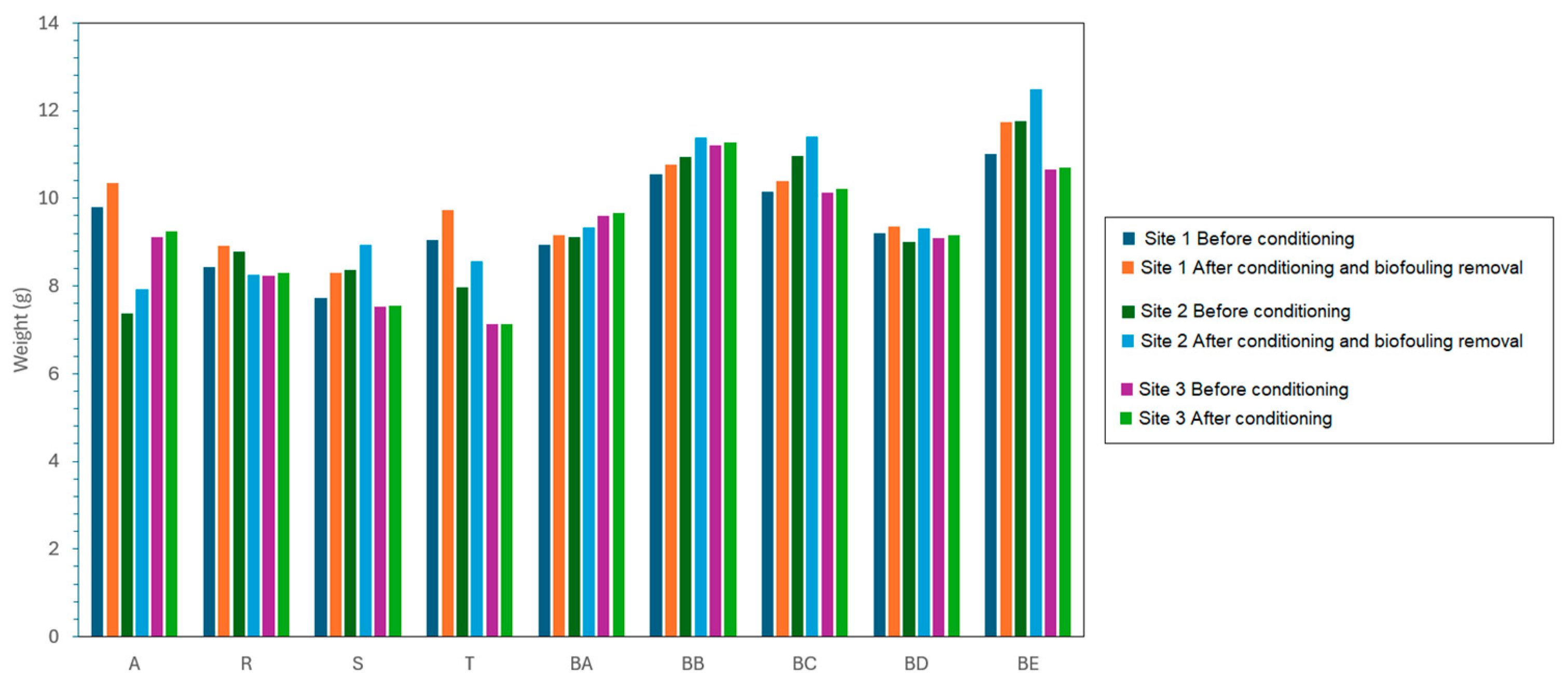 - Each sample was weighed before immersion (Starting Weight) and was weighed again after retrieval (Ending Weight). The biofouling material was then removed, and the percentage of weight gain was calculated. The obtained results (Figure 7) indicate a clear influence of material composition and exposure conditions on the absorption behavior. In general, specimens immersed at greater depths exhibited higher water uptake and biofouling accumulation compared to those positioned in the splashing zone, where prolonged dry periods and high solar radiation limited the moisture content and reduced the fouling effect to almost nothing. Among all samples, the highest weight increases were recorded for samples from Site 1, such as S1 (7.70%), T1 (7.67%), T2 (7.62%), A2 (7.42%), and BE1 (6.59%), suggesting that the siting of these materials made them more susceptible to water penetration and subsequent biological colonization. Conversely, samples from Site 3, such as T3 (0.09%), S3 (0.32%), BE3 (0.49%), and U3 (−0.04%), showed negligible variation, indicating higher resistance to water uptake and reduced fouling settlement. These results confirm that the water absorption capacity strongly depends on the polymer matrix type and the inclusion of natural fillers, which may alter the porosity and permeability of the composites. Furthermore, the synergy between the solidity of the structure and biofouling development highlights the relevance of surface properties in marine applications, where prolonged exposure can significantly affect both dimensional stability and long-term mechanical performance.