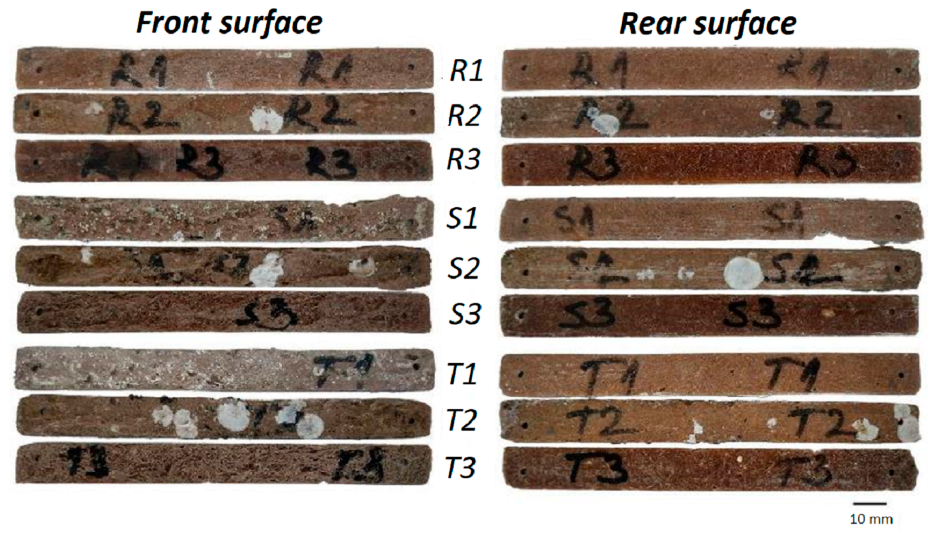 - Shore D hardness tests to verify by a simple and reasonably accurate method if some strength had been retained, considering that other tests (e.g., flexural testing) would lead to unreliable results for the point-to-point variability of the sample properties;