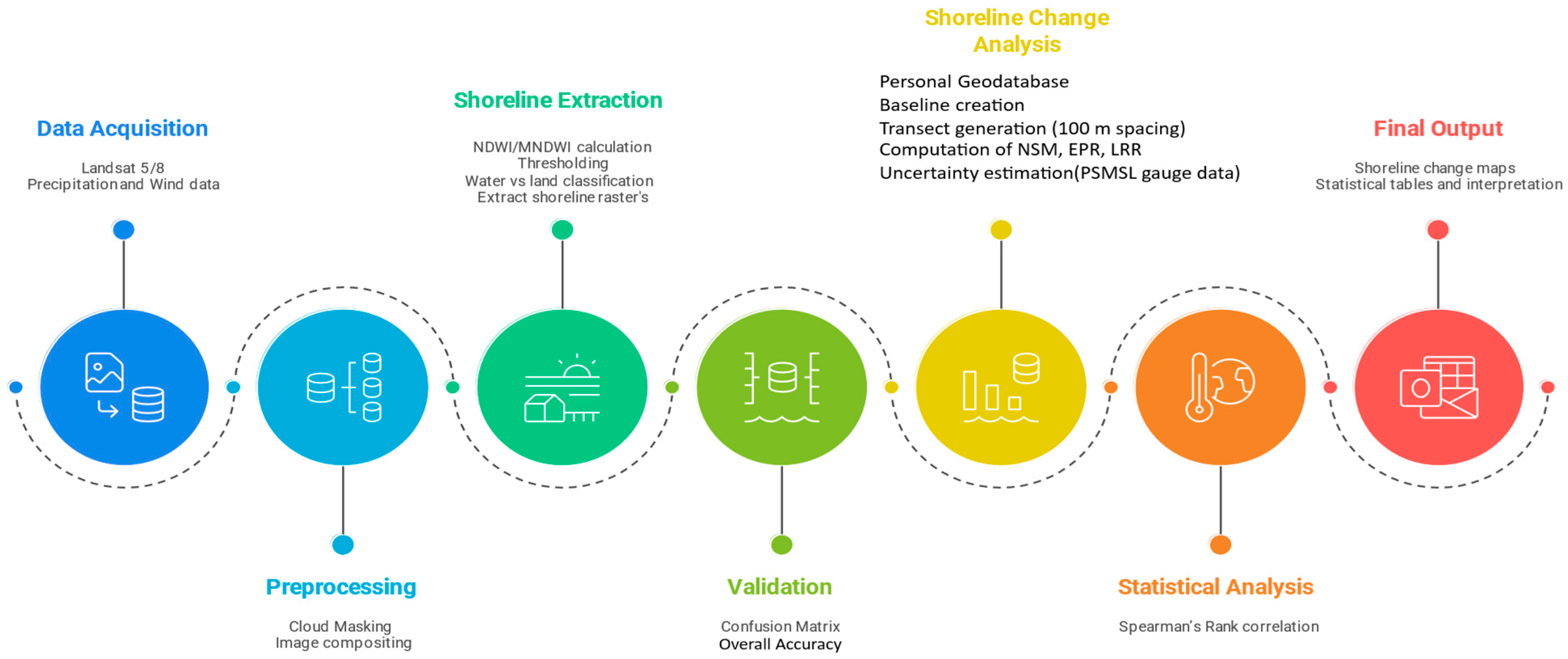 | Digital Shoreline Analysis System (DSAS) | An ArcGIS tool extension that automates shoreline change calculations by generating transects across coastline positions and calculates metrics like NSM, EPR, and LRR. | Provides a consistent framework to calculate and analyze shoreline changes across various delta segments. | DSAS enables reliable, repeatable, and spatially consistent analysis essential for monitoring and managing coastal dynamics in regions like the Indus Delta. |