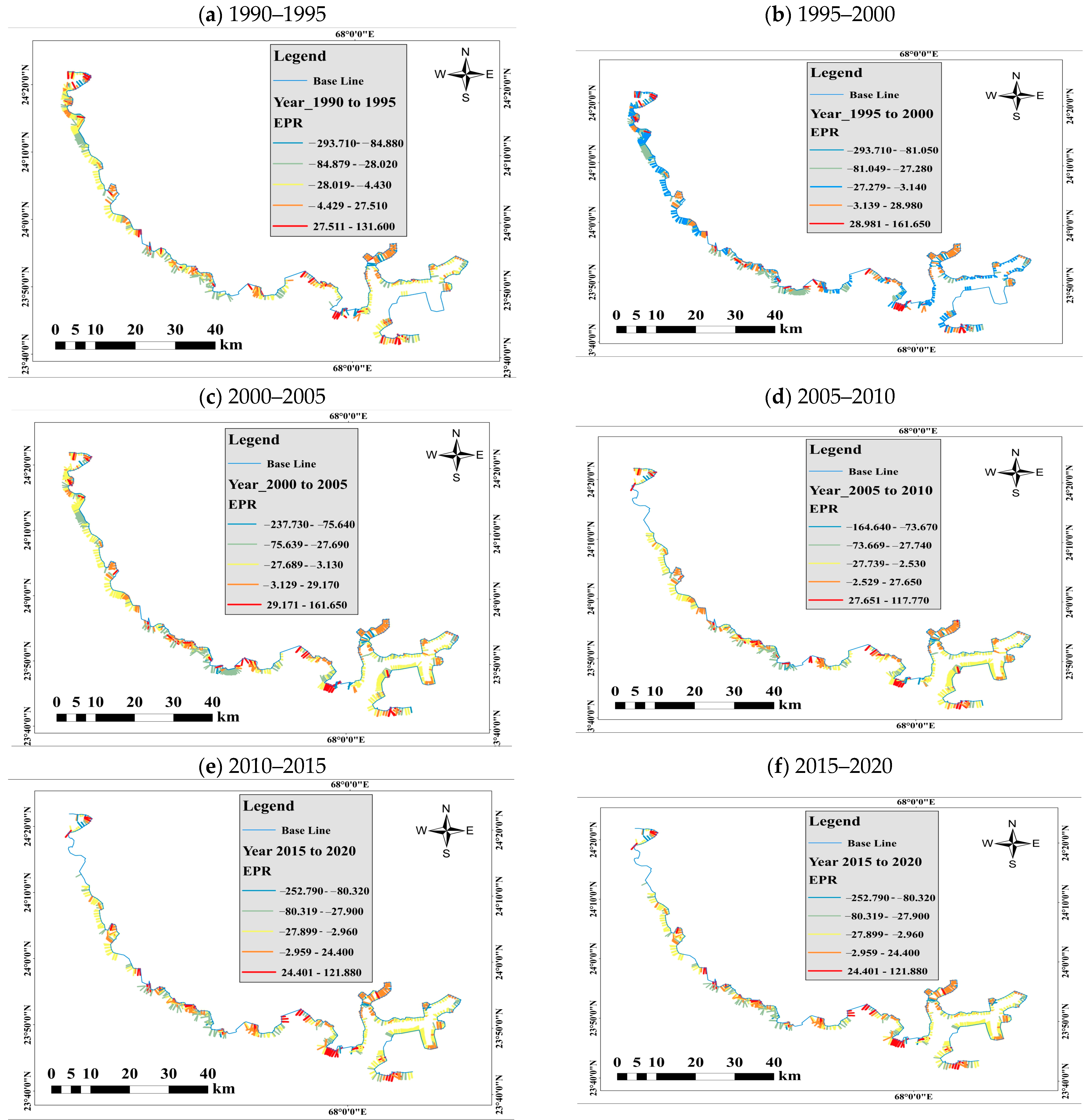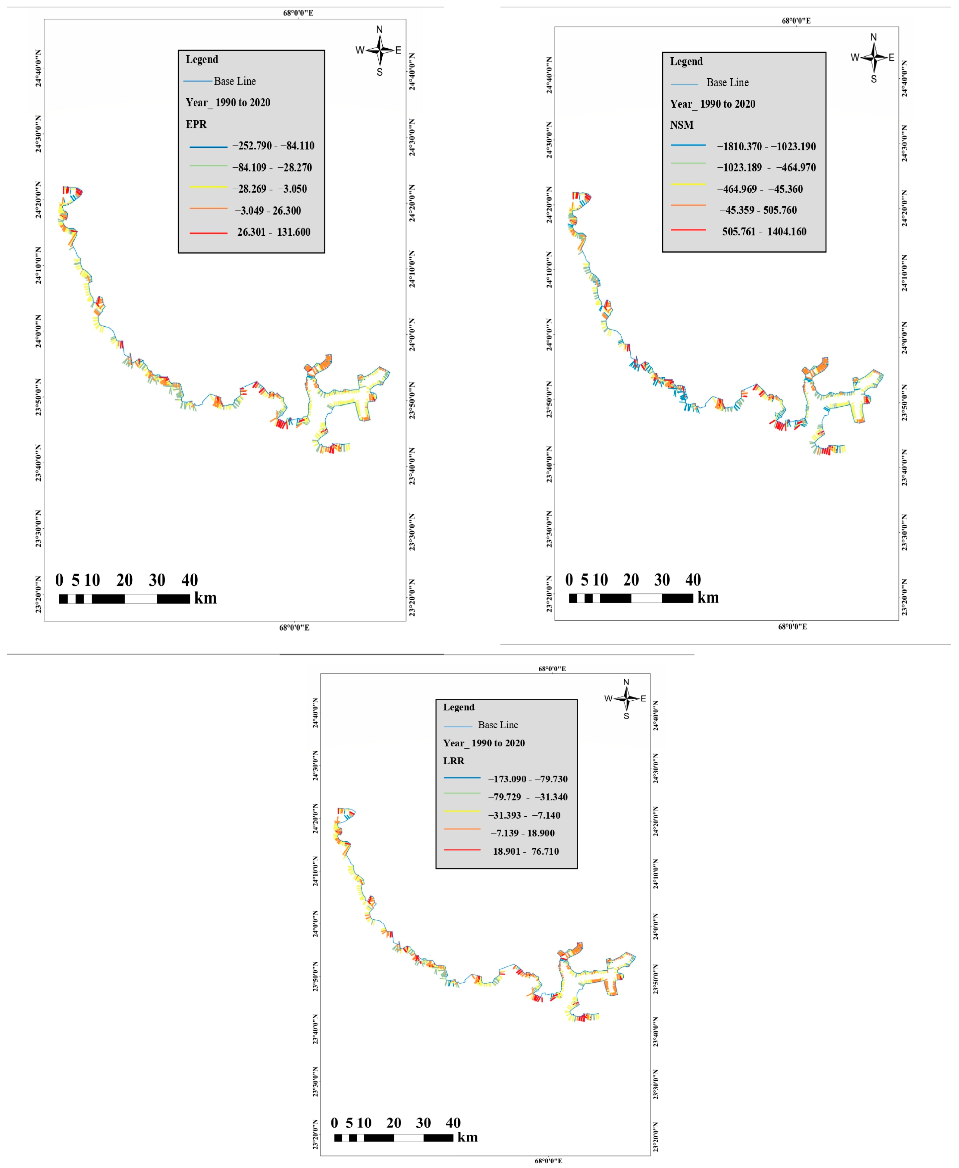 | End Point Rate (EPR) | Calculates the annualized rate of shoreline movement by dividing the NSM by the time between the earliest and latest shoreline positions. It provides a simple, average rate of change per year. | Provides a straightforward view of the rate of erosion/accretion in the delta’s segments over the studied period. | Higher positive values indicate rapid accretion, while higher negative values indicate rapid erosion. |