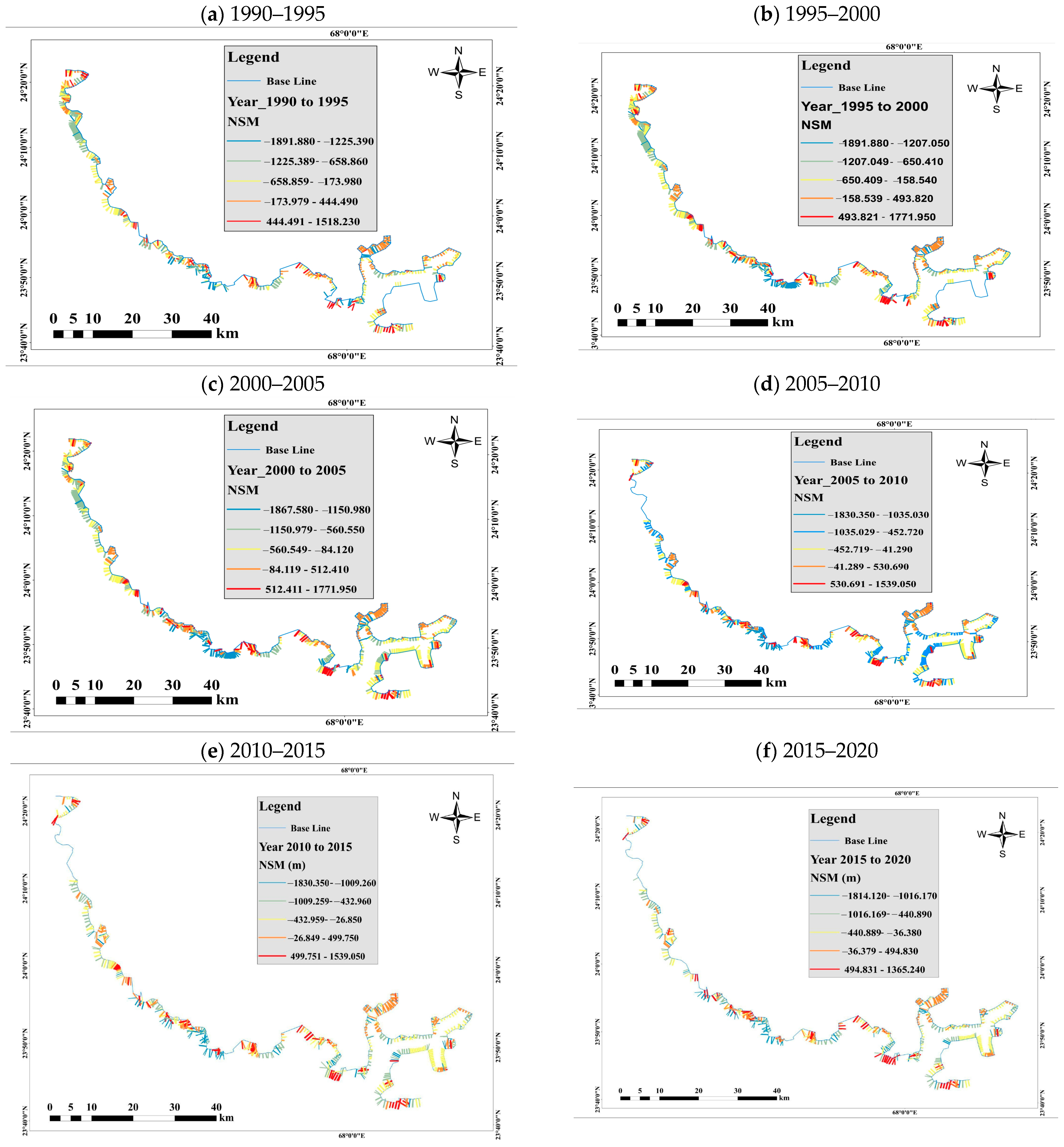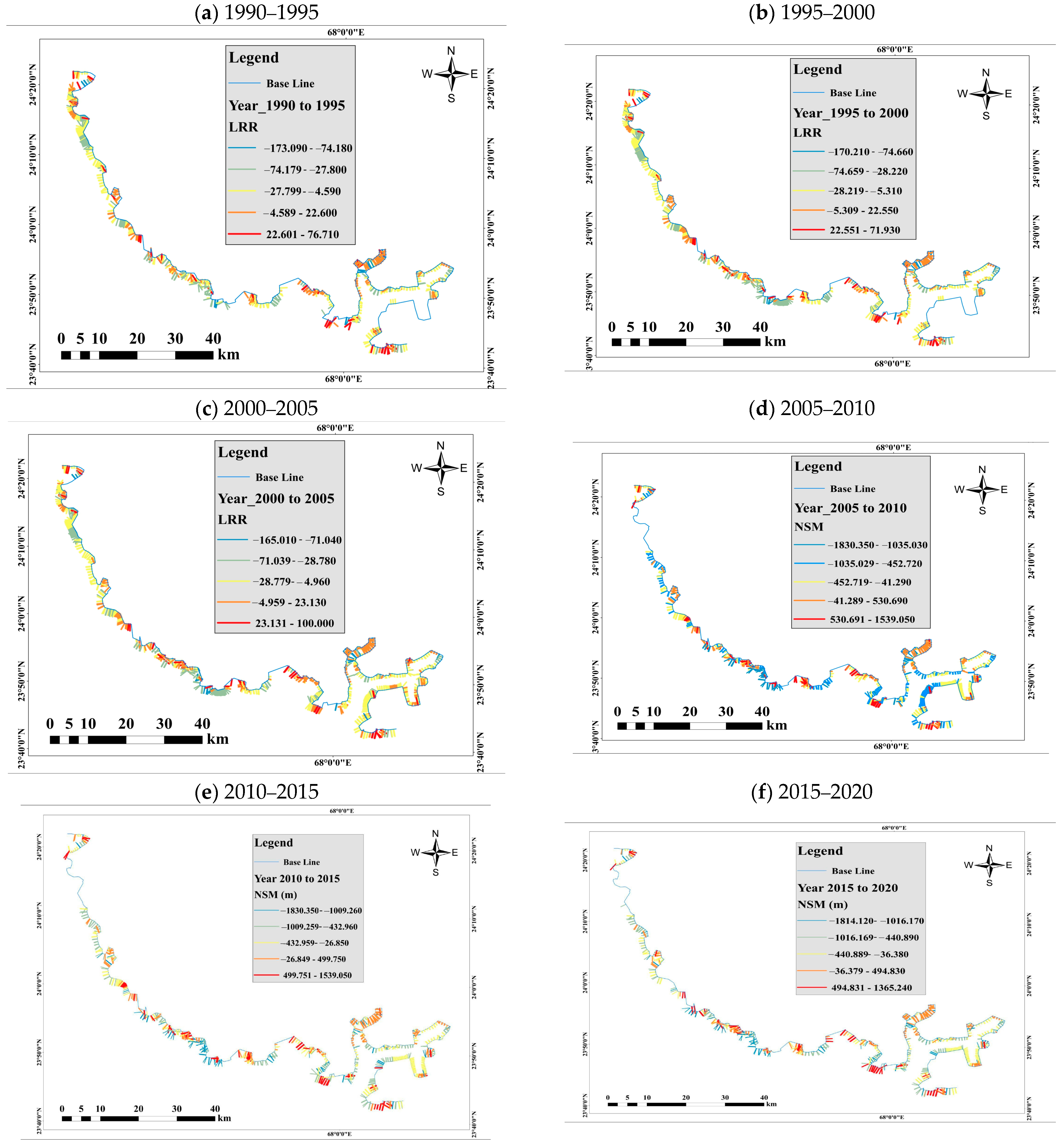 | Net Shoreline Movement (NSM) | Calculates the overall distance a shoreline has moved over different points. It calculates over time the cumulative impacts of coastline change, therefore measuring both erosion and accretion. | Helps determine areas of the delta that are undergoing significant shoreline shifts. | Positive values indicate shoreline advance (accretion); negative values indicate shoreline retreat (erosion). |