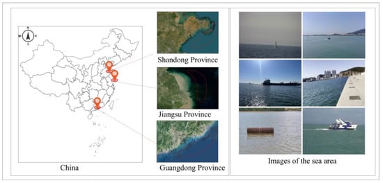 In this paper, the visual sensors carried by unmanned vessels (USVs) or ordinary boats are mainly used as the main data collection method, and fieldwork and on-water experiments are carried out in several regions of China. Based on the CS40P model unmanned vessel, the team carried out a large number of navigation experiments in offshore, oceanic, lake, and river waters to collect raw data under various practical application scenarios. These data are collected in real time by the visual sensors carried by the unmanned boat, and can be transmitted to a remote server via video streaming or saved on an edge computing platform, ultimately obtaining a large number of raw video sequences. During the experiment, the team covered a variety of weather conditions, including night, sunny, foggy, and rainy days, and collected rich environmental data. In addition, a large amount of data on water targets, such as boats, beacons, reefs, and driftwood, were also collected. Name this dataset USV-DATA. The specific collection locations are shown in Figure 1.