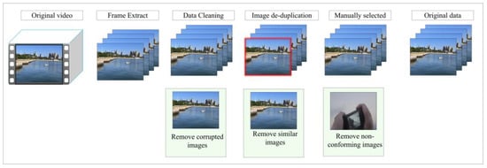 In the initial processing stage, images that did not meet the criteria due to blurring or corruption were eliminated by data cleaning. Subsequently, the structural similarity index (SSIM) algorithm [14], as in Equations (1)–(4), was utilized to compute the similarity of the images by luminance contrast, contrast contrast, and structural contrast, respectively, and finally, the redundant images with more than 80% similarity were de-duplicated. On this basis, further manual review means were used to eliminate the lower quality image samples. The specific processing flow is shown in Figure 3. After this series of rigorous screening and processing processes, a dataset called USV-DATA was finally constructed with 28,751 images.