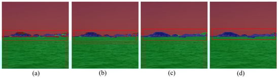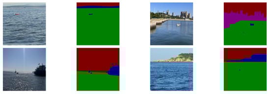 In the data annotation stage, this study adopts human-in-the-loop labeling method [15] and “Labelme” [16] for annotation. The interface of “Labelme” is shown in Figure 4, which contains working buttons such as the original data path, drawing annotation box, and save button; the middle area is the annotation area, and the drawing box divides the image into background, obstacle, self, sea, sky, etc. The right side contains category labels and file list. The middle area is the labeling area, and the polygonal box divides the image into background, obstacle, self, sea, sky, and other areas, and the right side contains class labels and file lists. Figure 5 illustrates the labeling results for some of the images.
