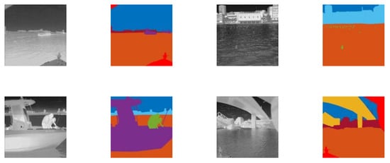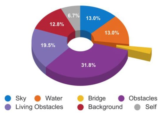In order to validate the effectiveness of the proposed semantic segmentation model, in addition to the experiments using a home-made dataset, we selected a recognized open maritime dataset, MASSMIND, a large-scale open dataset for the field of maritime automation, which is mainly used for the research of maritime autonomous ship sensing, target detection, path planning, and navigation techniques, for further evaluation. The dataset contains multimodal sensor data from different marine environments (e.g., high seas, ports, shipping lanes, and nearshore areas), including RGB images, depth images, LiDAR data, and radar images. The dataset covers the annotation of various marine targets and obstacles, such as ships, buoys, submersibles, islands, etc., and supports semantic segmentation and instance segmentation tasks. To improve the robustness of the model, MASSMIND also considers data under different weather (e.g., sunny, rainy, hazy days, etc.) and lighting conditions to help researchers develop perceptual systems that perform well in complex environments. All the images in this dataset and their labeled annotations are 640 × 512, totaling 2916 images with seven categories: Sky, Water, Obstacle, Living Obstacle, Bridge, Self, and Background, labeled Sky, Water, Bridge, Obstacle, Living Obstacle, Background, and Self. examples. The distribution share in various classes is shown in Figure 6, where the shares of Sky, Water, Bridge, Obstacle, Living Obstacle, Background, and Self are 13.0%, 13.0%, 3.2%, 31.8%, 19.5%, 12.8%, and 6.7%, respectively. Some of the image data are shown in Figure 7.