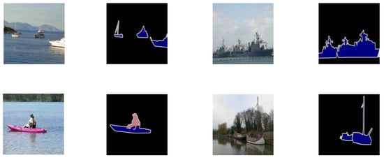 To demonstrate the generalization capability of USVS-Net, the publicly available dataset “The PASCAL Visual Object Classes 2007” (Pascal VOC2007) was chosen to validate the algorithm’s effectiveness. The image data for Pascal VOC2007 is shown in Figure 8. It is widely used as a benchmark in the Pascal VOC challenge and encompasses 20 object categories. Each image in the dataset is annotated with objects from these categories, including humans, animals (such as cats and dogs), vehicles (like cars, boats, and airplanes), and household items (e.g., chairs, tables, and sofas). It is worth emphasizing that the PASCAL VOC dataset is not a dataset dedicated to the maritime domain, but it contains images of ships at sea as well as a variety of other categories of objects. The purpose of choosing this dataset is to verify whether USVS-Net can still achieve accurate segmentation of maritime objects such as ships in a generalized dataset that contains rich categories and complex scenes. This design not only examines the relevance and robustness of the algorithm in ship segmentation tasks, but also evaluates its generalization ability in multi-category coexistence scenarios, thus demonstrating the broad adaptability and reliability of USVS-Net in practical applications.