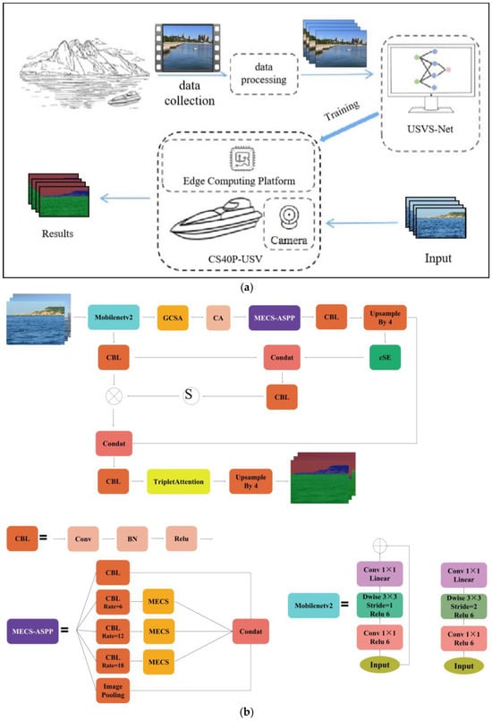 Method diagram. (a) Overall methodology flowchart of the proposed USVS-Net-based semantic segmentation framework for USV applications; (b) USVS-Net.