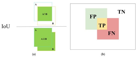 The intersection of union (IoU) is a measure of the degree of overlap between the predicted results and the real labels, which can be calculated by referring to Equation (12), and is illustrated in Figure 12a. The mean intersection ratio (mIoU) is the average of the intersection ratios of all categories, and the detailed calculation method is shown in Equation (13).