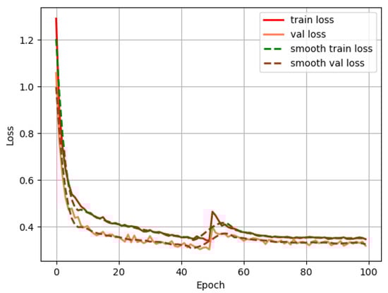 During the training process, we used stochastic gradient descent (SGD) to update the weights, and the total training duration was set to 100 epoch. To improve the training efficiency, an adaptive learning rate adjustment strategy was used. For the performance evaluation of the model, the Dice Similarity Coefficient Loss function (Dice Loss) is used. Its schematic diagram can be referred to in Figure 12b, and the definition is given in Equation (14).