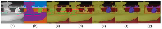 In order to observe the comparison results more intuitively, visualization experiments are carried out, and the results are shown in Figure 14. In Figure 14a–g are images, labeled SENet, CBAM, GCSA, MECS, and GCSA-MECS, respectively. From Figure 14c,d, it can be clearly observed that SENet and CBAM, due to the lack of sufficient feature extraction capability and pixel resolution, make mistakes in pixel classification and misclassify the characters on the ship, the obstacles in the far distance, as the ship; from Figure 14e, it can be seen that due to the adoption of MECS module, the pixel attention of the network is enhanced, thus possessing superior segmentation effect than SENet and CBAM, and can accurately recognize the characters and other kinds of figures in the figure; from Figure 14f, it can be seen that due to the adoption of MECS module, the pixel allocation ability of the network is enhanced, which makes the network have excellent segmentation effect and can accurately describe the details such as edges and lines; from Figure 14g, it can be seen that the performance of the network has been further improved after the simultaneous adoption of the MECS module and the GCSA module, which can not only accurately segment the image, but also describes the details such as edges and lines clearly, which proves once again the superiority and compatibility of the two modules.