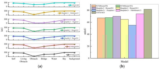 Figure 21 shows the comparison of IoU metrics for all class segmentations, and Figure 22 shows the visualization results. Figure 22 shows that USVS-Net’s segmentation metrics are higher than those of other mainstream networks and lead the segmentation results in all classes.