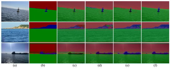 Visualization results. (a) Original image, (b) label, (c) FCN(Resnet101), (d) Deeplabv3(Rsenet50), (e) Deeplabv3+(mobilenetv2), (f) USVS-Net.