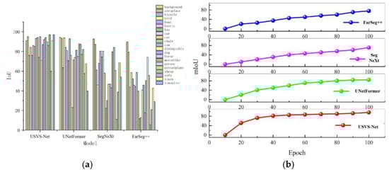In order to validate USVS-Net, we chose “2007 PASCAL visual object categories” as the dataset, and chose the SOTA algorithm for the comparison experiment. These SOTA algorithms are FarSeg++ [19], SegNeXt [20], and UNetFormer [21]. Figure 21 shows the comparison of the intersection ratio (IoU) metrics and the mean intersection ratio (mIoU) metrics for all category segmentations, and Figure 22 shows the visualization results.