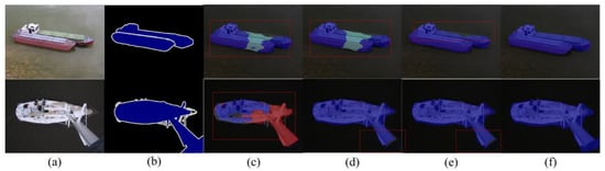 As can be observed, Figure 22c–f are the segmentation result maps of different algorithms and Figure 22c,d are the segmentation results of FarSeg++ network and SegNeXt network; due to the lack of sufficient spatial information extraction ability and global information-focusing ability, pixel classification error occurs between recognizing the ship and the other categories, which leads to the ship being recognized as the other classes, which seriously affects the segmentation accuracy. Figure 22e shows the recognition results of UnetFormer algorithm, which not only suffers from insufficient contour recognition accuracy, but also suffers from great errors in the recognition of details such as the edge lines of the ship. Figure 22f shows the USVS-Net, which can show that, due to the adoption of the GCSA module, the loss of spatial information is reduced and the recognition rate of the ship is improved; the MECS module distinguishes the important frequency-domain information by extracting the global statistical information and capturing the representative features of different scales, which realizes the accurate segmentation of details such as edges and lines, and segments the edges and lines in a smoother and more natural way for the edges of ships. Figure 21 and Figure 22 show that the segmentation effect of USVS-Net proposed in this paper on the Pascal VOC2007 dataset is superior to that of some mainstream networks, which proves that the network has advanced segmentation ability.