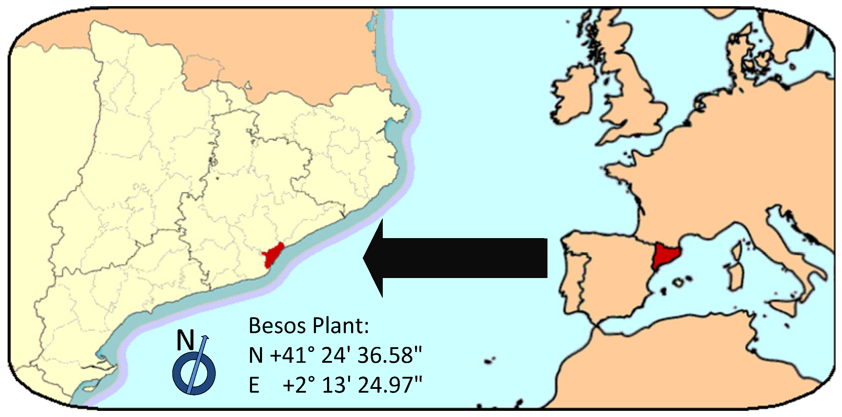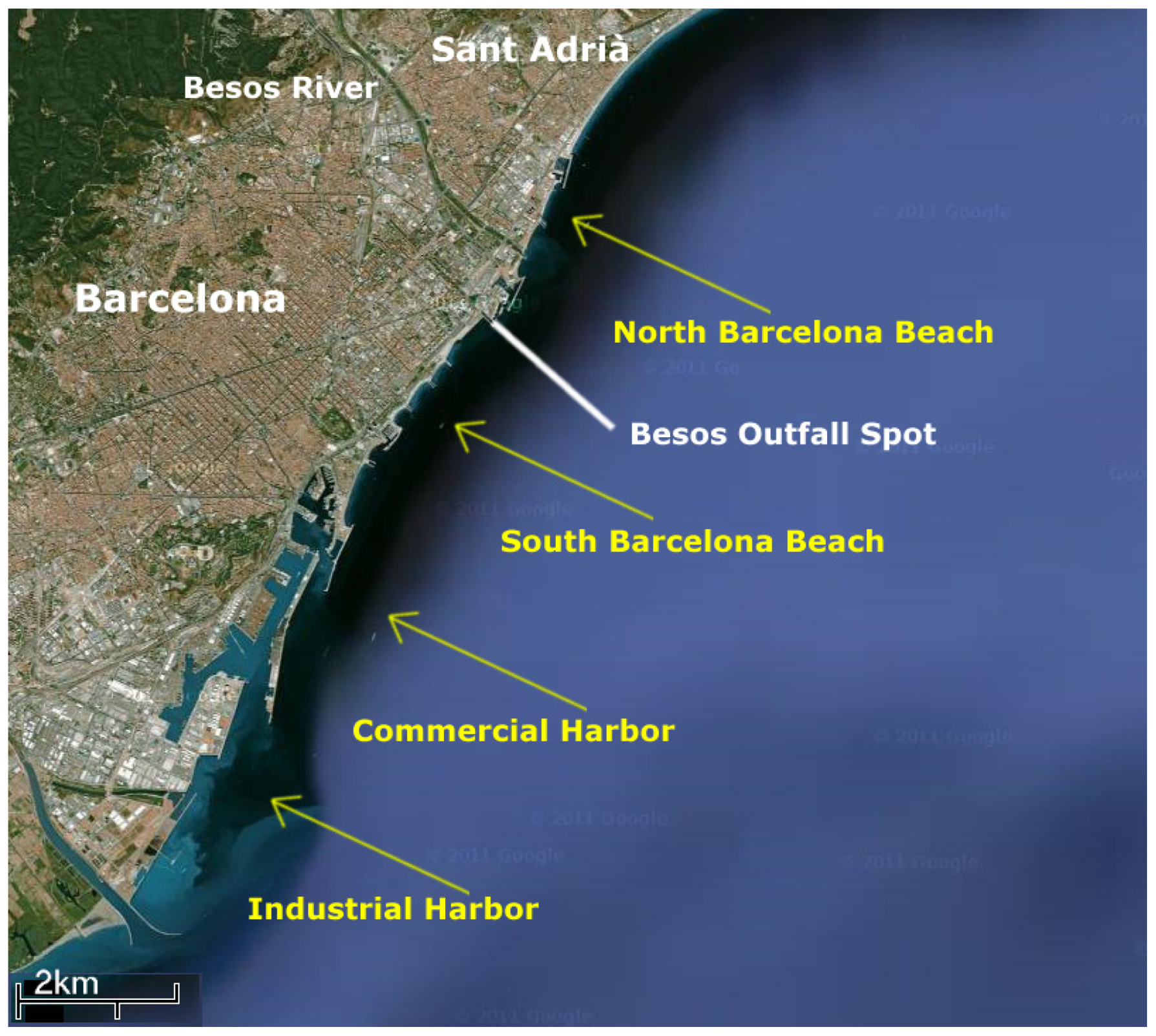 This study focuses on the northern part of Barcelona and, specifically, the wastewater treatment plant near the Besòs River. On both sides of the Besòs River estuary, there are recreational areas that attract thousands of visitors throughout the year—not just in summer—thanks to Barcelona’s mild climate. Many visitors swim and practice water sports on the beaches located both north and south of the wastewater plant.