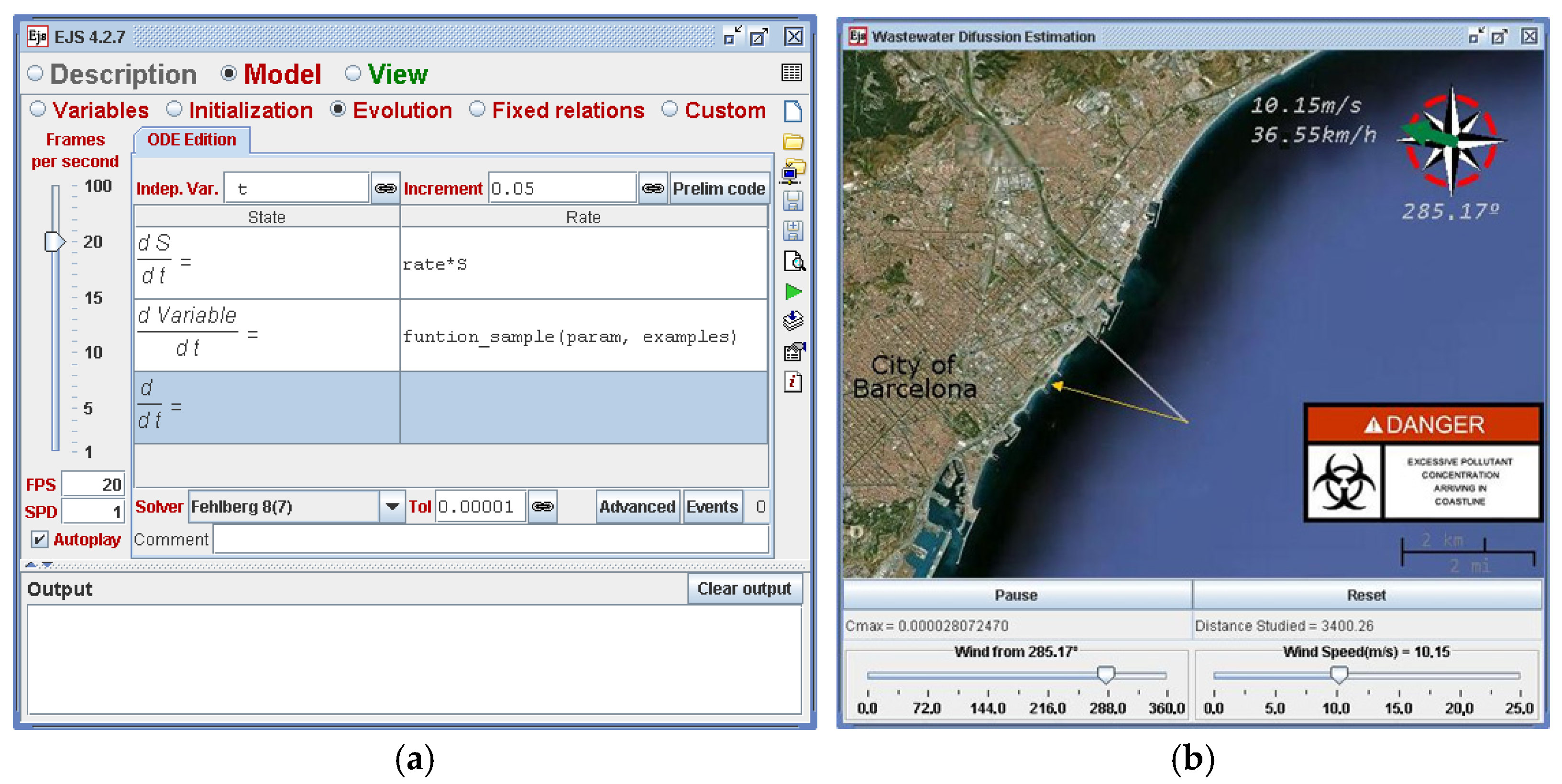 31] to help wastewater plant managers analyze, study, and forecast coastal pollution hazards. This simulator makes it easier to predict potential alarm situations and prevent harm to the population. It is designed as a user-friendly tool, requiring no advanced computer skills for effective use. To study the collected data and validate the proposed model for the dilution, dispersion, and reach of wastewater discharged through the Besòs outfall, a computer simulation known as STORMYSIM, version 2.3, was implemented. The simulation core is based on JAVA technologies, allowing for the integration of custom tools and mathematical libraries and enabling multi-platform software development. The main development platform used was Easy Java Simulations (EJS) [