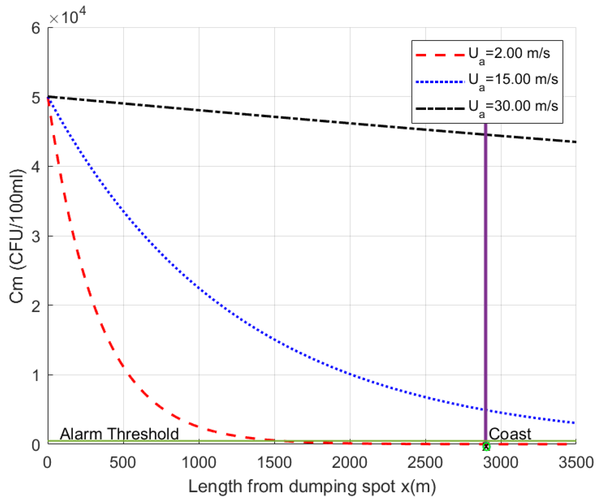 Cm at any point. Thus, only dilution and diffusion due to water current turbulence and bacteriological treatment are accounted for. In order to calculate