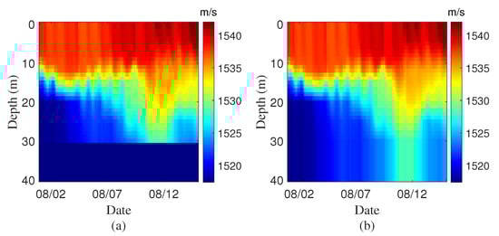 The hydrophone spacing determines the spatial sampling of the wavefront curvature. Small spacing ensures the spatial coherence of the signal but may fail to resolve multipath differences, whereas large spacing provides sufficient path delay differences to improve resolution but reduces coherence between receivers. Therefore, this section analyzes the sensitivity of coherent wavefront delay extraction to varying SSP conditions and hydrophone spacing configuration. Figure 1a shows SSP obtained from the HYCOM data for the East China Sea area (30.64 N, 122.80 E), where our experiment was conducted, from 1 August to 15 August 2023 (https://www.hycom.org/), with the SSP forecasting at 3-h intervals. In this area, the HYCOM data provides SSP sampled at 13 non-uniformly spaced depth levels, with no values below 30 m in Figure 1a. Figure 1b presents the complete SSPs along the water column after linear extrapolation to the SSP data. The sound speed in seawater is primarily governed by three fundamental physical parameters: temperature, salinity, and hydrostatic pressure [33]. SSP structure in shallow water is relatively simple and typically lacks a deep-water sound channel axis like that found in the deep ocean. In summer, as illustrated by the HYCOM SSP in Figure 1a, solar heating warms the surface layer, forming a warm water mass, beneath which lies cooler water, resulting in a negative sound speed gradient [33]. The significant change in the SSP around 12 August likely corresponds to dynamic processes at the sea surface, such as typhoon. These influences cause the SSP to exhibit rapid spatiotemporal variations, which can differ significantly from hour to hour and day to day.