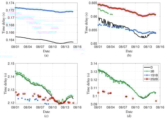 For D (black line in Figure 2c) and 3B (green line in (Figure 2c,d) arrival, their acoustic paths span only part of the water column depth. When there are significant changes in adjacent SSPs in the time dimension, the path lengths for different rays belonging to the same arrival wave type can differ substantially. This leads to significant oscillations in the calculated time delays. In contrast, paths with specific reflection counts like 1S1B (blue line) and 2S2B (red line) traverse the entire water depth. For these arrival types, the path length changes between different paths of the same arrival wave are small, resulting in more stable time delays. This means D and 3B paths are more sensitive to various arrival types to SSP variations. For the entire observation period, the time delay variations in D (black line) and 3B (green line) in Figure 2c are generally larger than those of 1S1B (blue line) and 2S2B (red line).