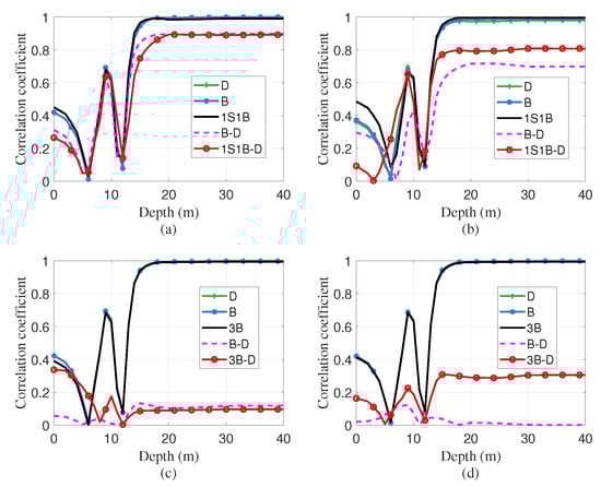 Correlation coefficients of both time delays (green line for direct arrival (D), blue line for single bottom-reflected arrival (B), black line for other arrival path) and time delay differences (red and magenta line) with HYCOM SSP perturbation at different depths: (a–d) illustrate results for hydrophone spacings of 0.25 km, 1 km, 3.25 km, and 4.75 km, respectively. The horizontal axis indicates the SSP depth, and the vertical axis represents the calculated correlation coefficient.