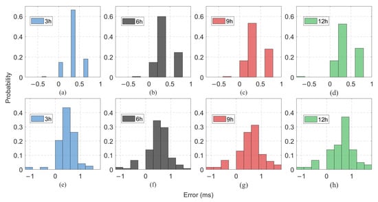 The blue, black, red, and green histogram correspond to different accumulation times of 3 h, 6 h, 9 h, and 12 h, respectively. The simulation frequency band is 20–200 Hz. The error increases with hydrophone spacing. For example, when the hydrophone spacing is 1.5 km (Figure 4a–d), the time delay error for a 12 h accumulation period is within 1 ms in Figure 4d. In contrast, for a 3 km spacing (Figure 4e–h), the corresponding error increases to 2 ms in Figure 4h, due to the longer propagation paths being more sensitive to SSP variability.