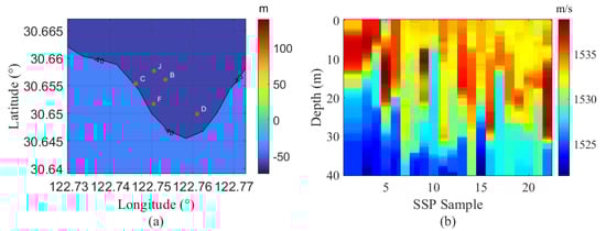 (a) Deployment positions of five self-recording acoustic hydrophones (B, C, D, F, J). (b) A total of 22 SSPs at different time instants measured by the conductivity-temperature-depth (CTD) profiler.