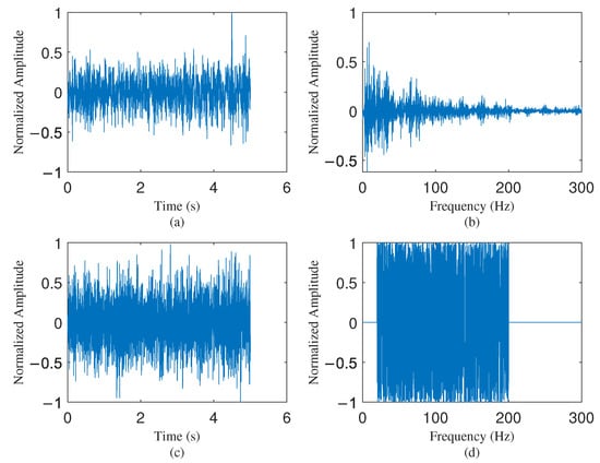A 5-s segment of data before and after pre-processing, shown in both the time and frequency domains: (a) Raw data in the time domain; (b) Raw data in the frequency domain; (c) Pre-processed data in the time domain; (d) Pre-processed data in the frequency domain.