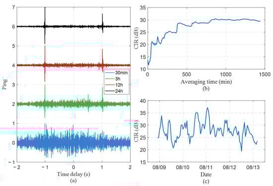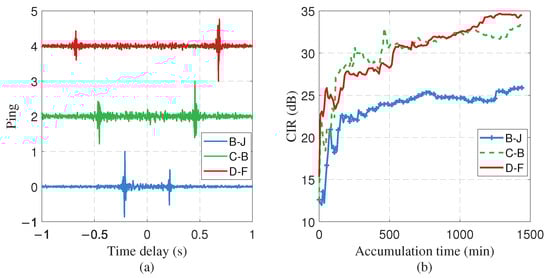 where is the recording duration, 0.95–1.05 s is around the expected coherent peak, and the period 1.3–1.5 s has the residual temporal fluctuations. Generally, CIR increases with a longer accumulation time. However, once the accumulation time exceeds a certain threshold, no significant further improvement in CIR is observed (as shown in Figure 7b). It can be observed that after 24 h of accumulation, the CIR increases by approximately 17 dB in Figure 7b. The deterministic features of all NCFs emerge from the random background after 3 h of noise accumulation (Figure 7a). Considering the presence of interferences with varying locations and intensities across different time periods (such as passing vessels and other active sound sources in the non-endfire direction), the CIR corresponding to 3-h accumulations from different time segments consequently exhibits fluctuating values in Figure 7c. Similar conclusions can be drawn for the other three hydrophone pairs (B–J, C–B, D–F) in Figure 8, with