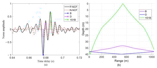 The direct path (D) usually has the shortest travel time and highest energy, appearing as the earliest and strongest peak in the NCF. However, for seafloor hydrophones in shallow water, the arrival times of D and the bottom-reflected path (B) can differ by just milliseconds, especially with closely spaced hydrophones. The correlation coefficients (Figure 11b) for arrival paths of D and B are very close, making separation between the two paths infeasible. Since the two cannot be reliably distinguished in time, we treat this combined peak as the reference arrival for computing delay differences used in subsequent path identification. This approach avoids the ambiguity of separating D and B and focuses instead on identifying paths with more distinct delay offsets, such as 1S1B and 2S2B.
