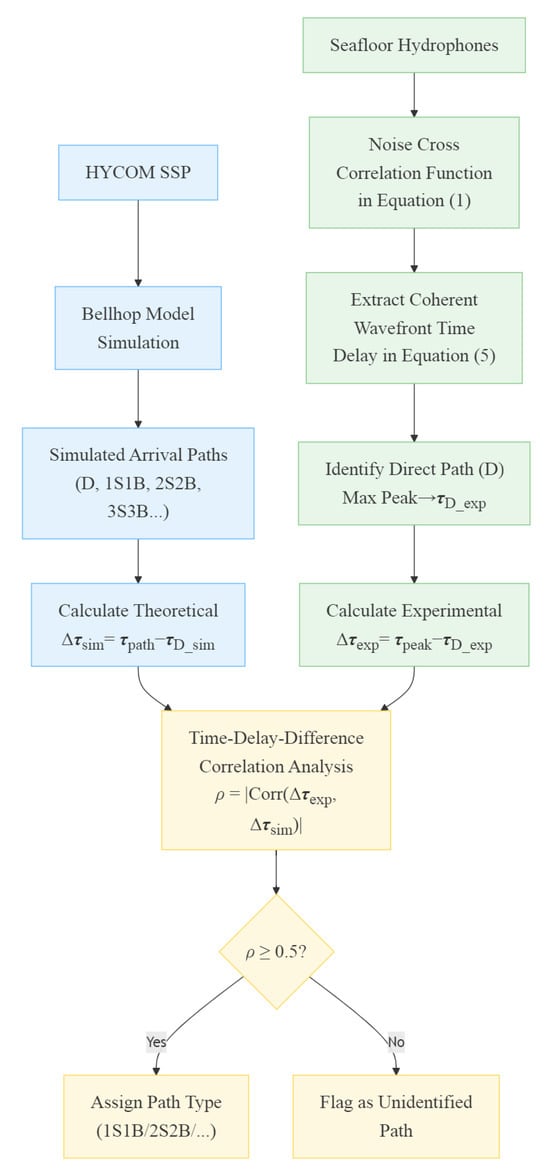 This section presents a comparative analysis of experimental results across three hydrophone pairs. As discussed in Section 3.2, once the arrival time of a reference path (here, the direct path D) is determined, the time delay differences with respect to the reference path are less sensitive to the SSP perturbation and thus more suitable for the path identification. The main procedure is illustrated in Figure 10. The detailed implementation steps and pseudocode are provided in Appendices Appendix A and Appendix B. HYCOM SSP inputs drive Bellhop simulation to generate theoretical arrivals (D, 1S1B, 2S2B, 3S3B, etc.). Cross-correlation of pressure signals between seafloor hydrophones yields coherent wavefronts with multiple peaks. Each peak’s arrival time is extracted for path identification.