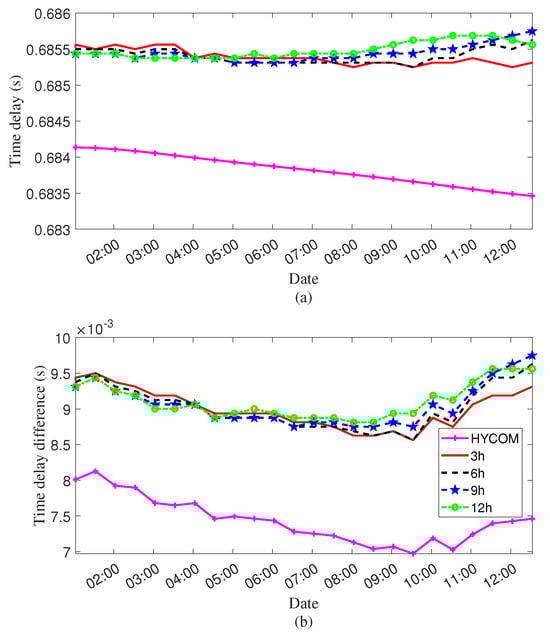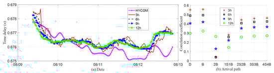 Figure 11 compares experimental and simulated arrival delays for the coherent wavefront extracted from hydrophone pair D–F under different accumulation times. In Figure 11a, the red, black, blue, and green lines represent the arrival delays of the dominant peak (typically corresponding to the direct or bottom-reflected path) extracted from the NCF using accumulation times of 3 h, 6 h, 9 h, and 12 h, respectively. The magenta line shows the simulated arrival time of the direct path obtained from Bellhop using HYCOM SSP. The results indicate that longer accumulation times yield smoother delay curves, as they average over more SSP variations and reduce the influence of transient fluctuations. In contrast, shorter accumulation times exhibit greater delay variability, likely due to increased sensitivity to interference and instantaneous SSP perturbations.
