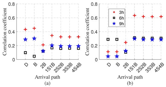 Correlation analysis between HYCOM-simulated multipath arrivals and the experimental results shown in Figure 12, based on (a) conventional absolute arrival times and (b) delay differences relative to the direct path.