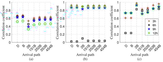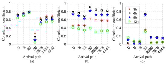 To quantitatively verify this observation, Figure 13 presents a correlation analysis comparing the simulation and experimental results using both absolute arrival times and delay differences. The results show that delay differences consistently yield higher correlation coefficients, demonstrating their superiority for robust path discrimination under uncertain environmental conditions. Also, correlation analysis using time delay differences between the experimental and HYCOM-simulated arrivals consistently identifies the second peak in the coherent wavefront (extracted from hydrophone pair D–F) as the 1S1B path, across accumulation times of 3 h, 6 h, and 9 h. In contrast, correlation analysis based on absolute arrival times yields weaker and less consistent results. Notably, the 3 h accumulation yields a correlation coefficient exceeding 0.6, further supporting this classification and demonstrating the robustness of using delay differences for path identification.