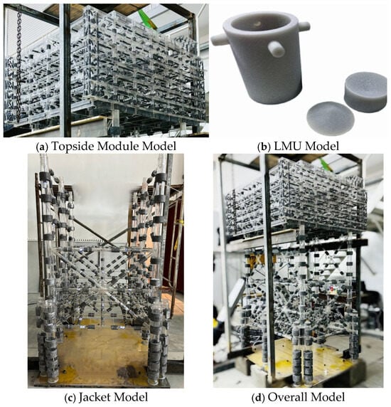 The experiment takes a 10,000-ton offshore converter station platform as the research object. Based on the elastic–gravity similarity criterion, a geometric scale ratio of 1:65 was selected for the physical model construction. As shown in Figure 1, the model consists of two main parts: the topside module and the jacket structure. The jacket is equipped with Leg Mating Units (LMUs), which buffer collisions as load is transferred from the barge to the jacket during float-over mating. In terms of geometry, the stabbing cone is mounted on the underside of the topside module, and the receiver is mounted on the top of the jacket; the receiver has a conical recess that mates with the cone. During float-over mating, the cone enters the recess under self-weight and guiding constraints; the conical interface provides a self-centering effect that converts small horizontal offsets and minor angular misalignments into normal contact forces along the cone surface, thereby guiding and aligning the module. In this study, the LMU was simplified for modeling (see Figure 1b): the shell, receiver, and cone were 3D-printed in fiber-reinforced nylon, and the internal buffering was represented by springs selected to match the prototype’s vertical stiffness (approximated by piecewise-linear segments). The lengths of tubular and beam members were scaled according to the geometric similarity ratio, while cross-sectional dimensions were designed based on similarity of the moment of inertia. To satisfy mass similarity, lead blocks and lead rings were used as counterweights [32]. The topside module and jacket were fabricated from acrylic (PMMA).