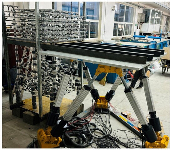 The docking collision test focuses on the impact that occurs during the mating process between the stabbing cone of the topside module and the LMU on the jacket structure. The topside module model is hoisted and released at a certain velocity (as shown in Table 3) using a six-degree-of-freedom (6-DOF) motion platform to achieve docking with the jacket model. Due to spatial constraints, the platform surface was extended, and the extended portion was considered an integral part of the motion platform. The overall experimental setup is shown in Figure 2 and Figure 3.