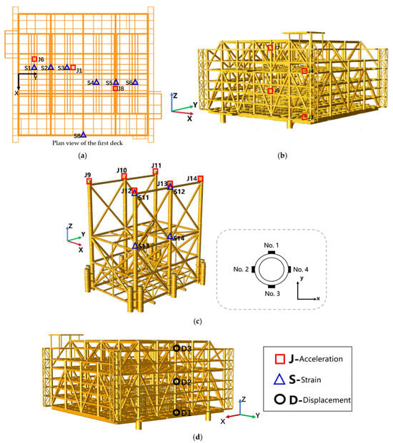 Considering that important electrical equipment needs to be installed on the first deck of the platform (as shown in Figure 4a), where all lines in the figure denote beams, three accelerometers and six strain gauges were installed at central locations on the deck, with all sensors mounted on the beams. The strain gauges were placed on the beam aligned with the x-axis and at positions midway between the two beams aligned with the y-axis. Additionally, four acceleration sensors were placed at the edges of different platform levels (as shown in Figure 4b), and one acceleration sensor was installed at each LMU. Two main legs were selected, with four strain gauges placed around the circumference at the top and mid-height of each leg (as shown in Figure 4c). Finally, three displacement measurement points were arranged on one side of the topside module (as shown in Figure 4d) to monitor its displacement variation.