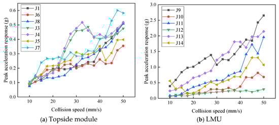 The peak acceleration responses at each measurement point under Condition Group A were obtained. Since each condition was tested three times, the average of the three peak values was used. The variation in peak acceleration response with increasing collision velocity was plotted as a point-line graph, as shown in Figure 5. Figure 5a,b represent the acceleration responses of the topside and the six LMUs, respectively. As shown in the figures, acceleration responses increase with rising collision velocity. In some velocity ranges, a decrease followed by an increase is observed, but overall, the structural acceleration response of the electrical platform shows an increasing trend. At a drop velocity of 50 mm/s, the maximum acceleration response among the topside measurement points is 0.58 g, while the maximum acceleration at the LMUs is 2.65 g. In addition, the acceleration response at the LMUs is greater than that of the topside due to their direct contact with the collision interface. When the collision velocity increases from 10 mm/s to 50 mm/s, the measurement point J8 on the topside shows the largest increase—up to 5.7 times. For the LMUs, point J11 exhibits the highest increase, up to 20.6 times.
